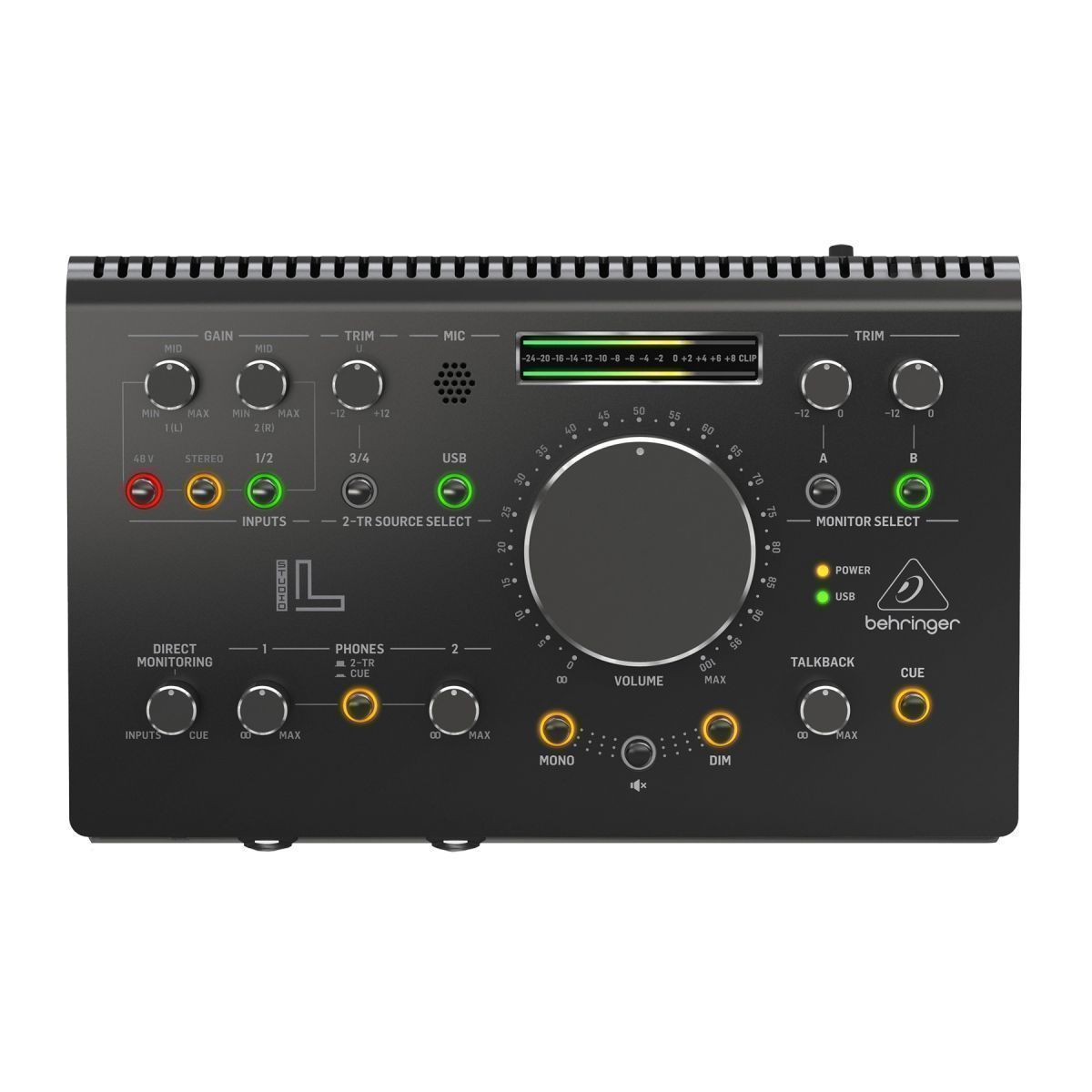 Behringer STUDIO L — это активный мониторный контроллер со встроенным USB-аудиоинтерфейсом на 192 кГц и 24 бита. Он оснащён 2 микрофонными предусилителями Midas с фантомным питанием. Одной из главных особенностей устройства является большой и точный регулятор уровня громкости, изготовленный по технологии VCA (Voltage Controlled Amplifier). Эта технология позволяет производить точный контроль сигнала с идеальной стереофонической и фазовой когерентностью, а также продлевает срок службы самого регулятора. Контроллер рассчитан на работу с двумя парами мониторов и может применяться в различных студиях или дома. Для того чтобы записи звучали хорошо везде, нужен необходимый контроль, например, это могут быть две пары абсолютно разных мониторных систем, две пары наушников. В контроллере установлен высокоточный двойной светодиодный измеритель уровня сигнала. Для общения с исполнителем в аппаратной предусмотрена система связи Talkback, а именно отдельная секция со встроенным микрофоном и с его регулятором уровня, ко