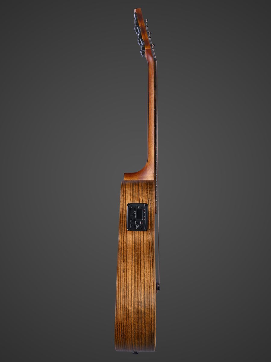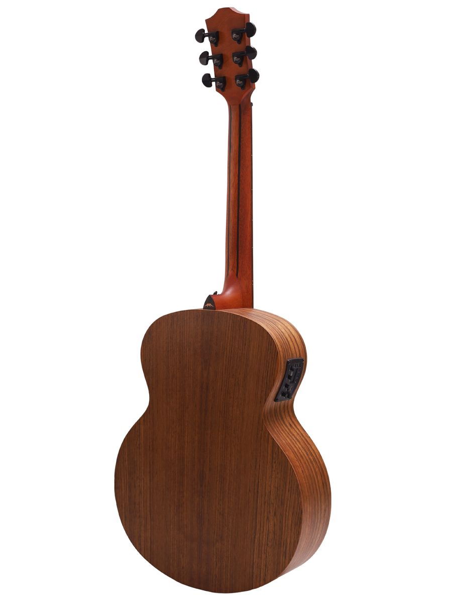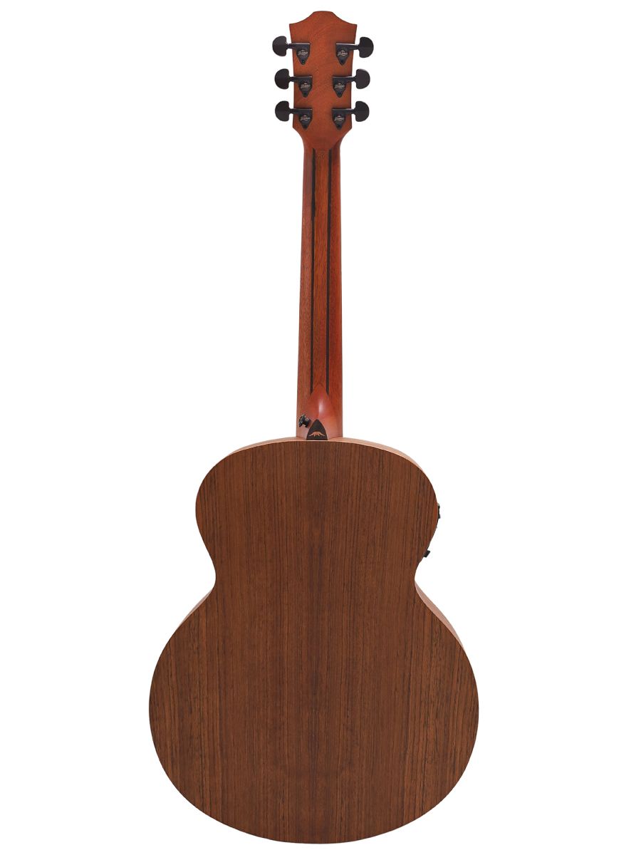 Серия: Tahoma Форма корпуса: Mini Jumbo Мензура: 597 мм (23.50”) Ширина грифа: 43 мм (1 11/16”) Верхняя дека: цельный махагони Нижняя дека и обечайка: орех Гриф / накладка грифа: махагони с двумя эбеновыми вставками / двухцветный макассарский эбен Анкерный стержень: двухсторонний Лого на голове: гора Бромо Оформление резонаторного отверстия: «Веревка» Бридж: "Mt. Bromo", черное дерево Amara Оформление грифа и пятки: гора Бромо Лады: Jumbo, 20 ладов Верхний и нижний порожки: Nubone XB Колки: литые "Mt. Bromo", черные Электроника: предусилитель с 4-полосным эквалайзером Bromo BZP1 Отделка: матовая с черной верхней декой