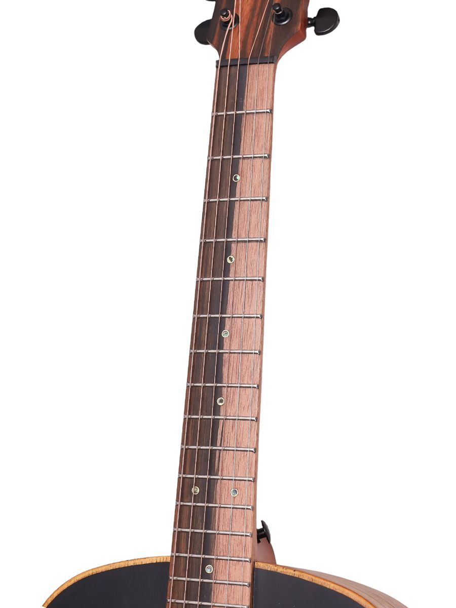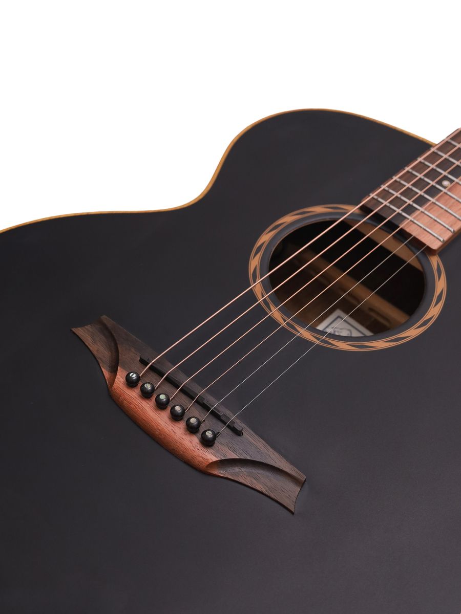 Электроакустическая гитара Bromo BAT8MEBK - это профессиональный инструмент с уникальным внешним видом и впечатляющими акустическими характеристиками. Формат Mini Jumbo - оптимальный баланс между компактностью и глубиной звучания. Удобный корпус не утомляет при долгой игре, но даёт богатый резонанс и хорошую проекцию звука. Верхняя дека из цельного махагони обеспечивает тёплый, сбалансированный тон с выраженными средними частотами и отличной артикуляцией. Запатентованная система крепления Tone-Flow Bracing System усиливает передачу вибраций по всему корпусу, обогащает тембр и делает отклик более отзывчивым. Нижняя дека и обечайка из ореха добавляет звуку глубины и яркости, подчёркивает верхние частоты, создаёт объёмную реверберацию. Гриф махагони с двумя вставками из эбена обеспечивает прочность, стабильность и долгий сустейн. Накладка грифа - двухцветный макассарский эбен, отличается плотностью и твёрдостью, что улучшает чёткость звучания и долговечность ладов. Двухсторонний анкер позволяет точно регулировать прогиб грифа под разные стили игры и условия окружающей среды. Матовая отделка с чёрной верхней декой придает инструменту стильный внешний вид и тактильно приятное покрытие, которое не скользит и не собирает отпечатки пальцев. Bromo BAT8MEBK – это не просто электроакустическая гитара, это ваш билет в мир выразительного звучания и компактного комфорта.