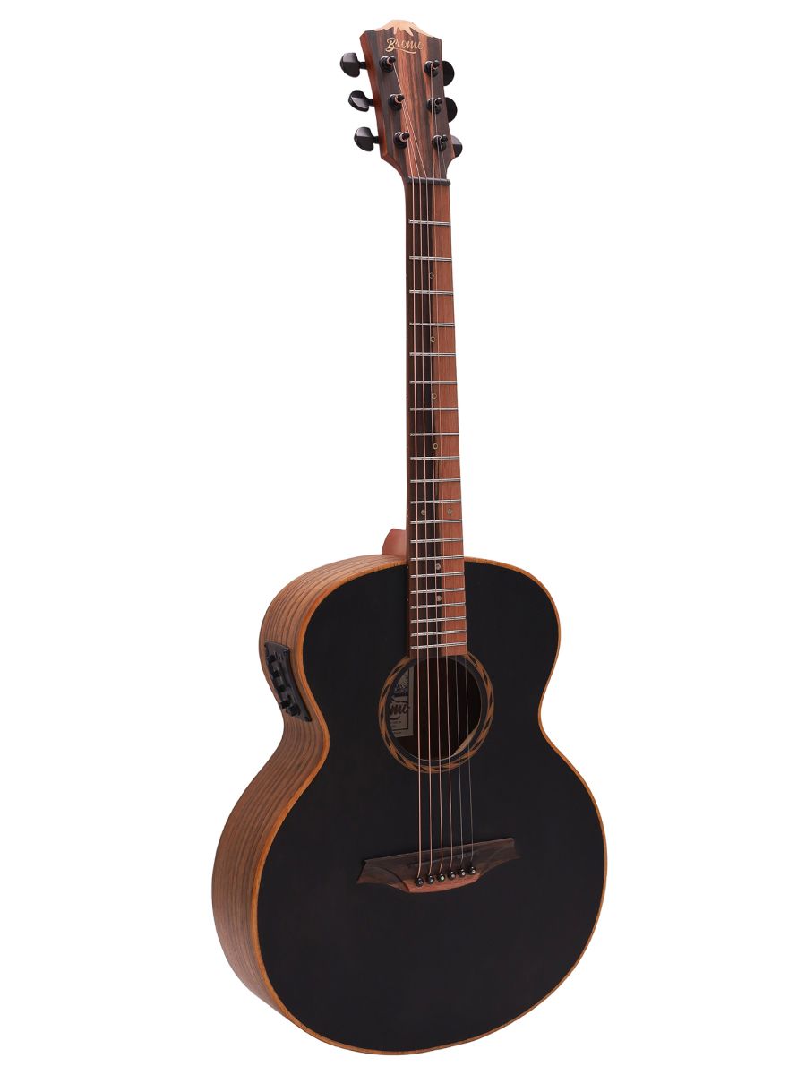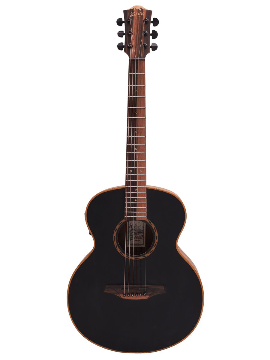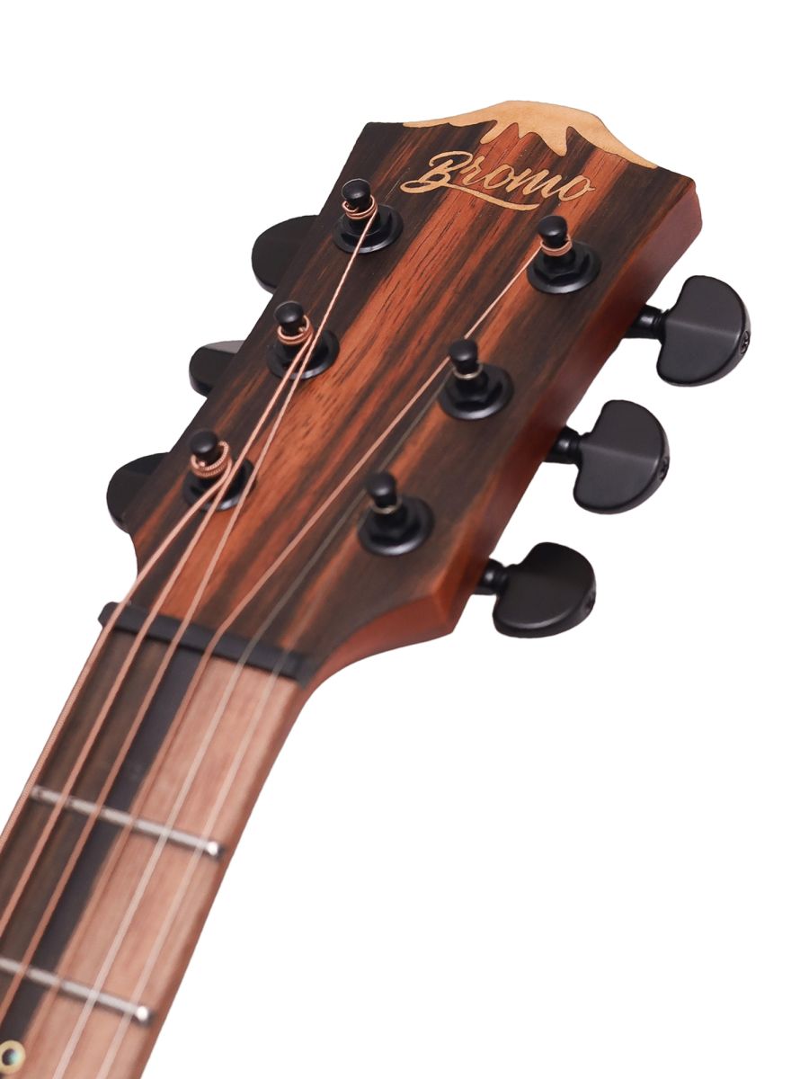 Bromo BAT8MEBK Гитара электроакустическая Mini Jambo, верхняя дека: цельный махагони, нижняя дека и обечайка: орех, гриф: махагони с двумя эбеновыми вставками, накладка грифа: двухцветный макассарский эбен, двухсторонний анкер, колки: литые "Mt. Bromo", черные, электроника: предусилитель с 4-полосным эквалайзером Bromo BZP1, матовая с черной верхней декой