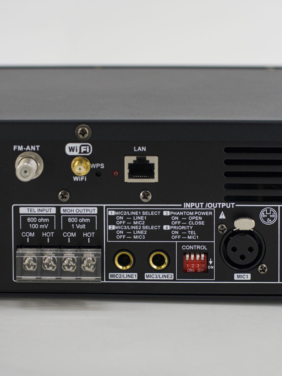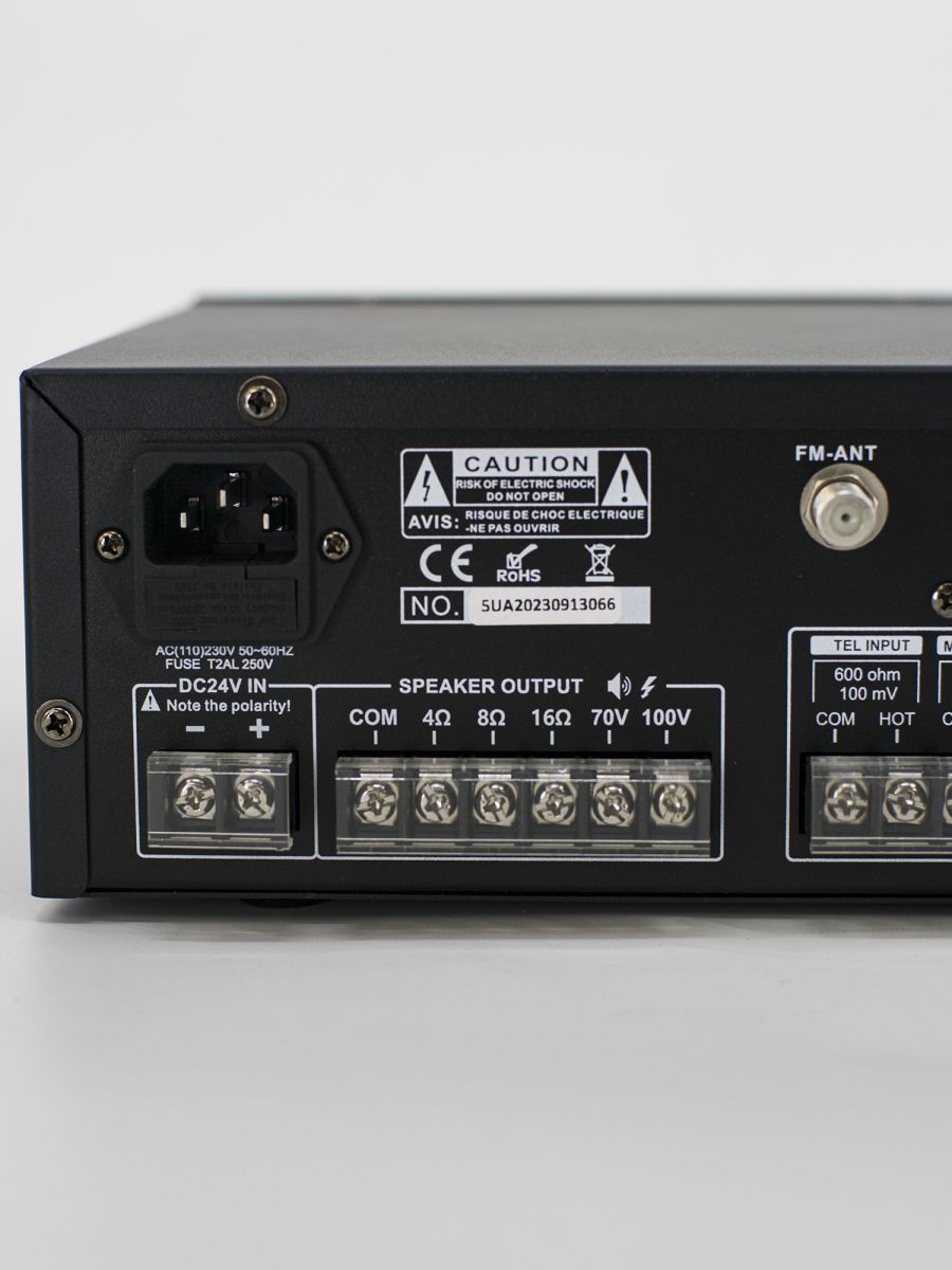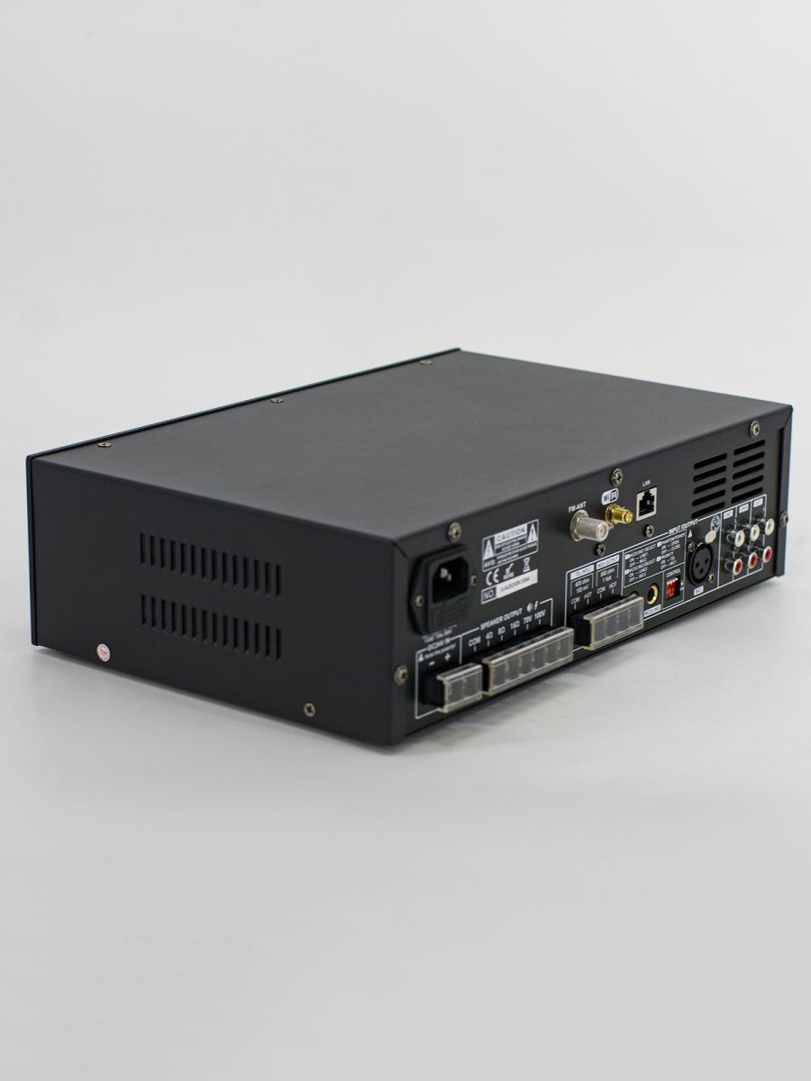 Мощность: 60Вт Разъемы: 3 Mic, 2 line Линейный выход: 70В/100В/4-16Ом USB/SD Mp3 плеер, FM тюнер, Wi-Fi интернет стрим, Bluetooth