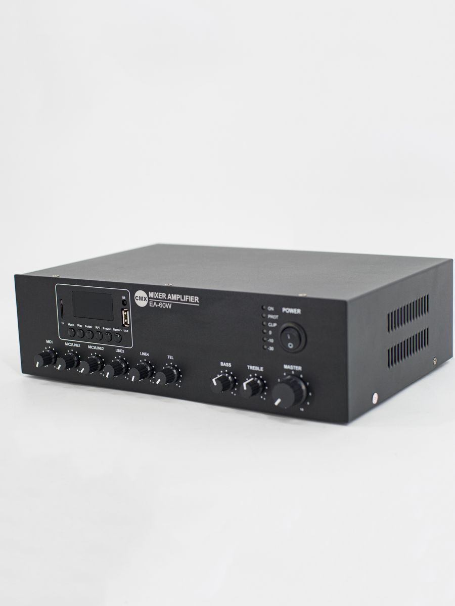 CMX Audio EA-60W представляет собой качественный микшер усилитель мощностью 60 Вт. Модель оборудована защитой от короткого замыкания, зажима, перегрузки и высокой температуры.