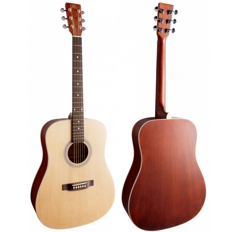 SX SD204 Гитара акустическая, верхняя дека ель, нижняя дека и обечайка: агатис, гриф: габон, накладка грифа и нижний порожек: палисандр, колки: хромированное покрытие, цвет натуральный