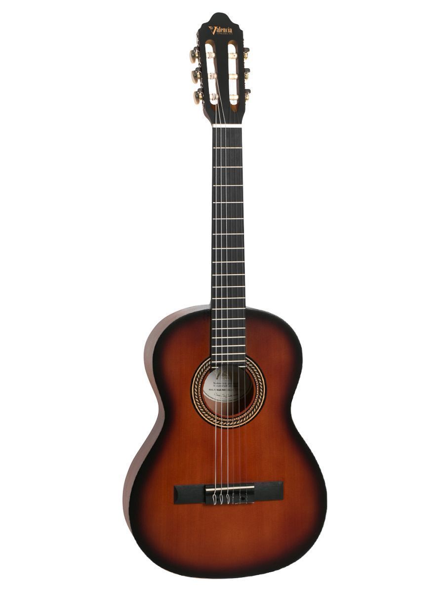 Valencia VC203CSB Гитара классическая 3/4, верхняя дека: ель, нижняя дека и обечайка: нато, гриф: махагони, накладка грифа и нижний порожек: махагони, колки: винтажные, никель, цвет Classic Sunburst